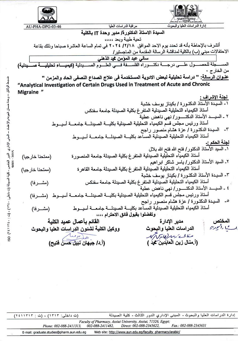 مناقشة الرسالة المقدمة من الماجستير / سالي عبدالمؤمن محمد الذهني- المسجلة للحصول على درجة دكتوراه الفلسفة فى العلوم الصيدلية (كيمياء تحليلية صيدلية) من الخارج يوم الأحد الموافق 18 فبراير 2024