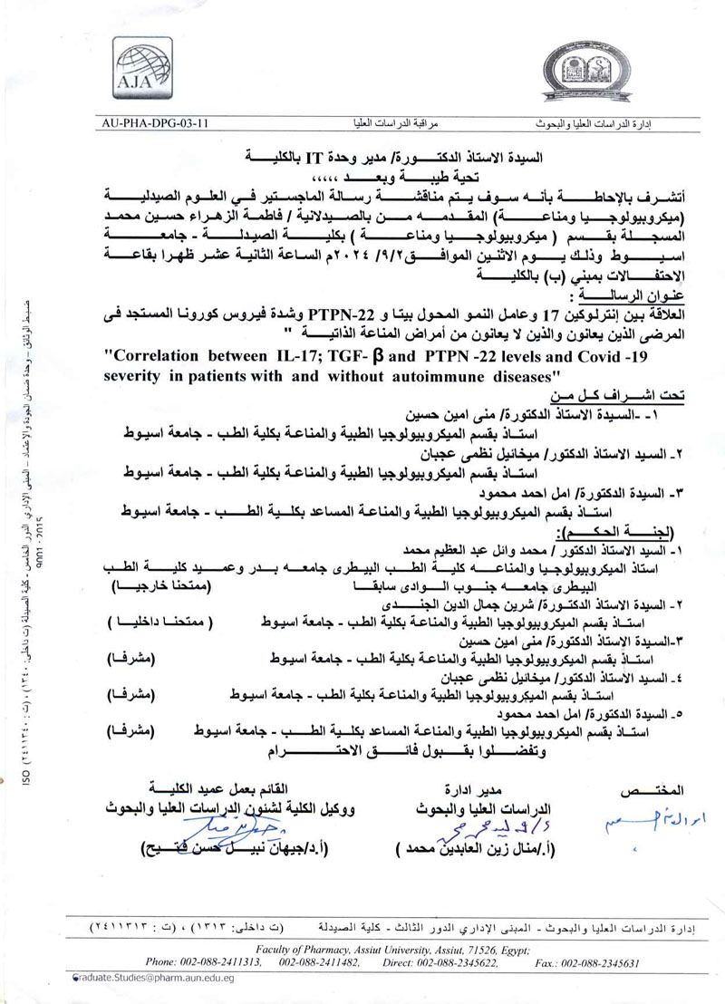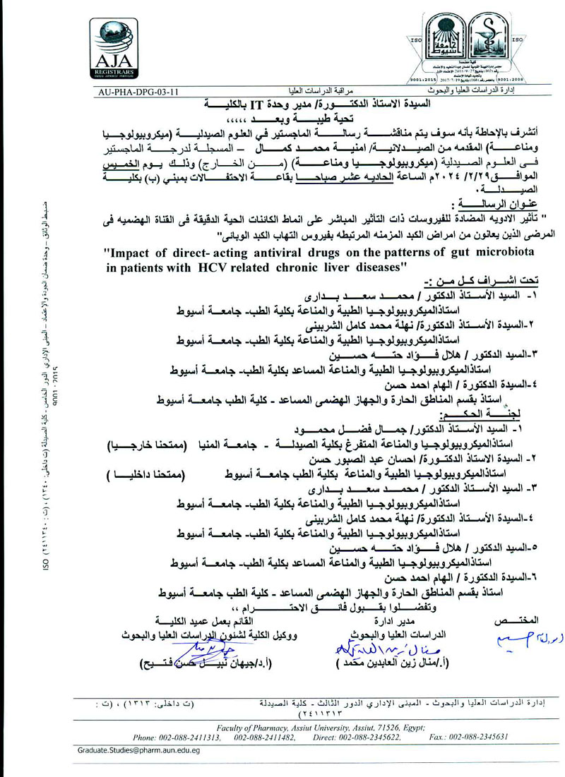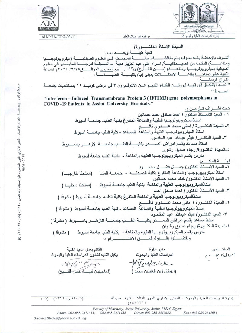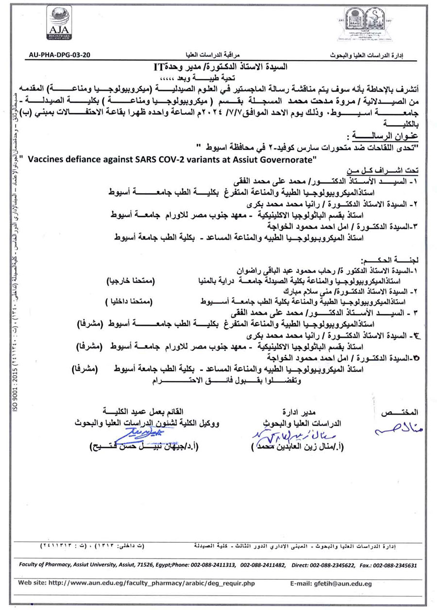 مناقشة الرسالة المقدمة من الماجستيرمن الصيدلانية / فاطمة الزهراء حسين محمد - المسجلة بقسم (ميكروبيولوجيا ومناعة) يوم الأثنين الموافق 2 سبتمبر2024