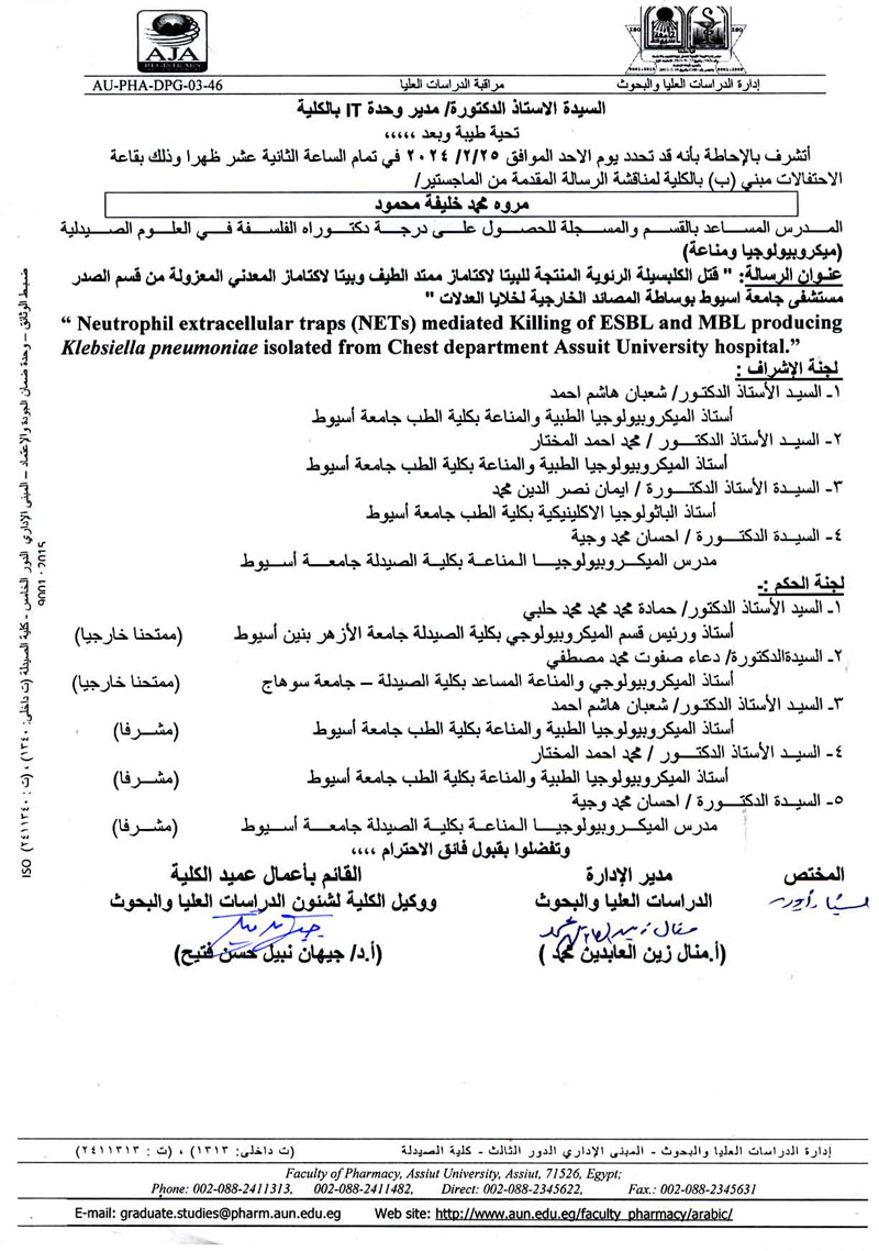 مناقشة رسالة الماجستير المقدمة من الصيدلانية/ نورهان عاطف عبد العظيم- لنيل درجة الماجستير فى العلوم الصيدلية (ميكروبيولوجيا ومناعة) من الخارج يوم الخميس الموافق 21 مارس 2024