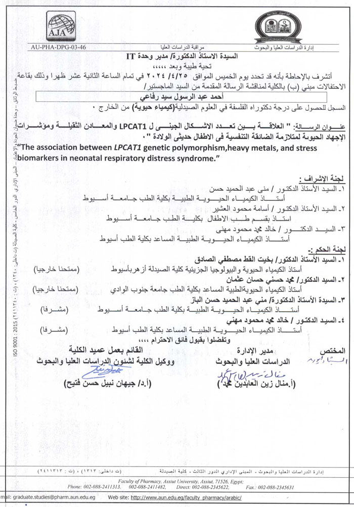 مناقشة رسالة المقدمة من السيد الماجستير/ أحمد عبد الرسول رفاعي- المسجل للحصول على درجة دكتوراه الفلسفة فى العلوم الصيدلية (كيمياء حيوية) من الخارج يوم الخميس الموافق 25 أبريل 2024