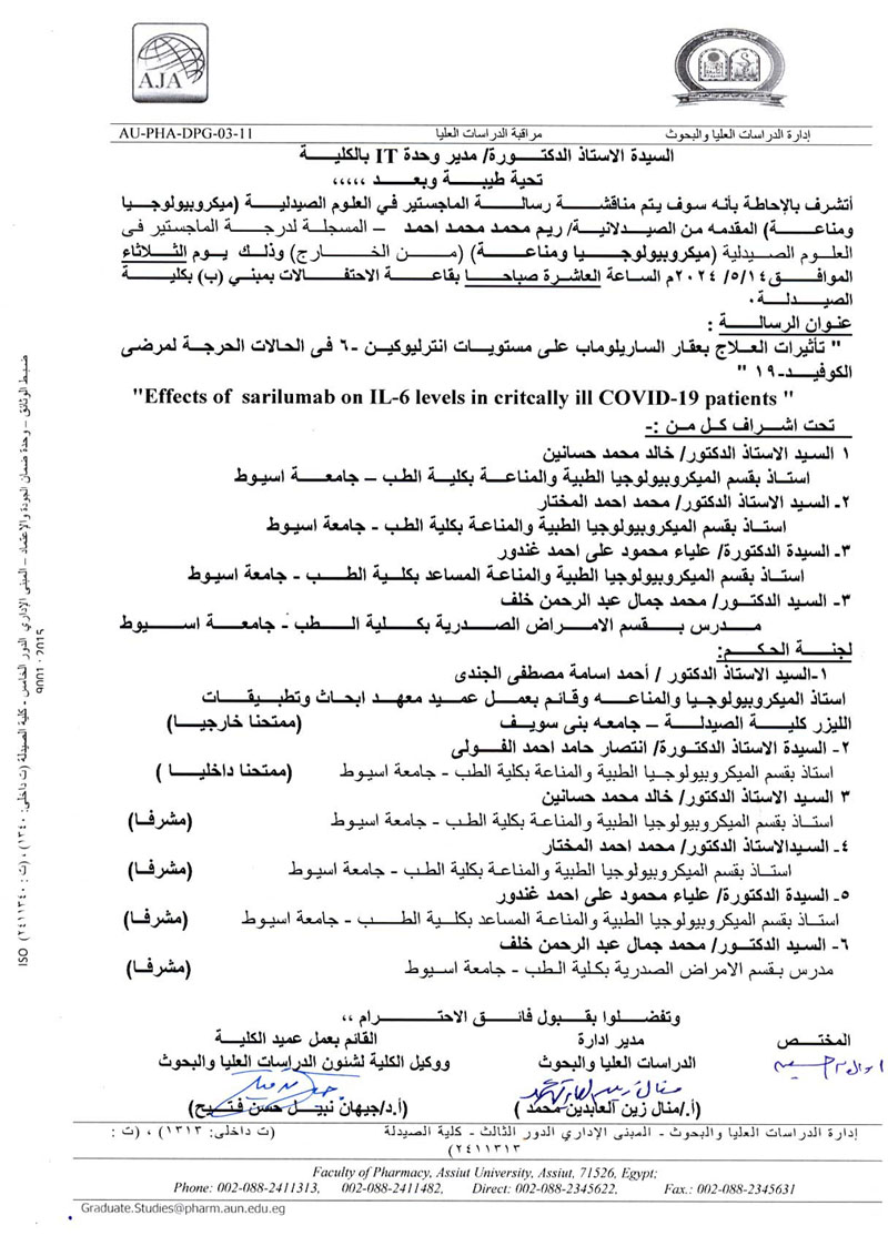 مناقشة رسالة المقدمة من الصيدلانية/ ريم محمد محمد أحمد- المسجلة للحصول على درجة الماجستير فى العلوم الصيدلية (ميكروبيولوجيا ومناعة) من الخارج يوم الثلاثاء الموافق 14 مايو 2024