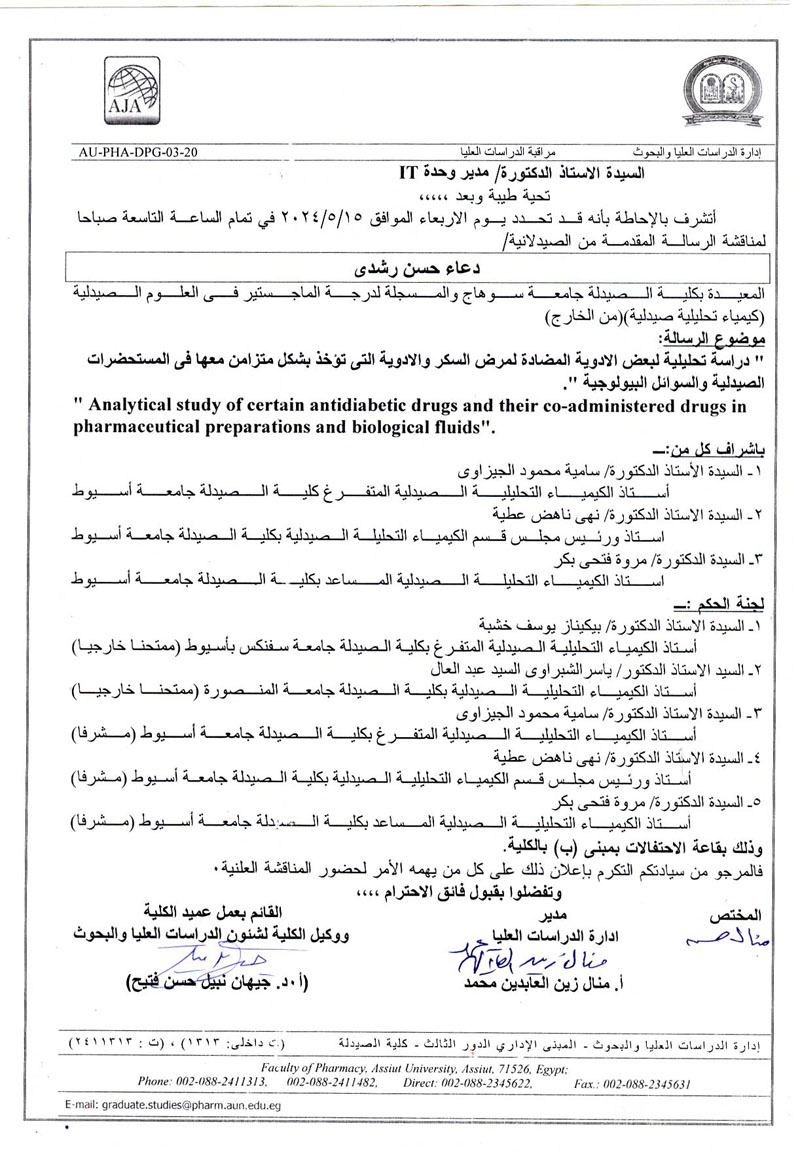مناقشة رسالة المقدمة من الصيدلانية/ دعاء حسن رشدي- المسجلة للحصول على درجة الماجستير فى العلوم الصيدلية (كيمياء تحليلية صيدلية) من الخارج يوم الأربعاء الموافق 15 مايو 2024