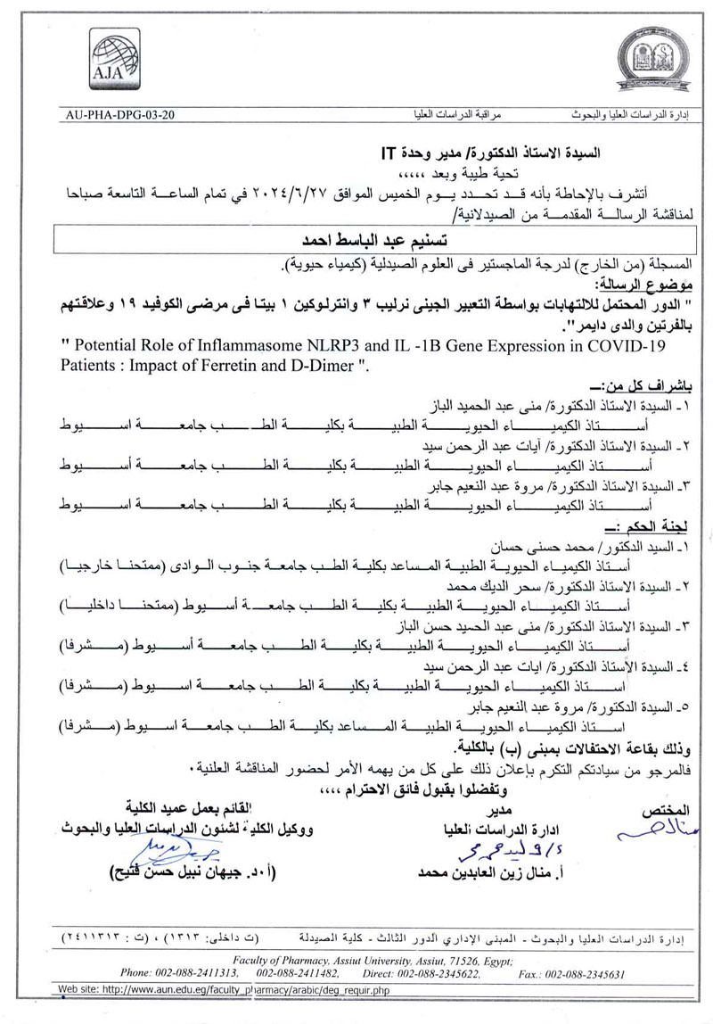 مناقشة رسالة المقدمة من الصيدلانية/ تسنيم عبد الباسط أحمد- المسجلة (من الخارج) لدرجة الماجستير فى العلوم الصيدلية (كيمياء حيوية) يوم الخميس الموافق 27 يونيو 2024