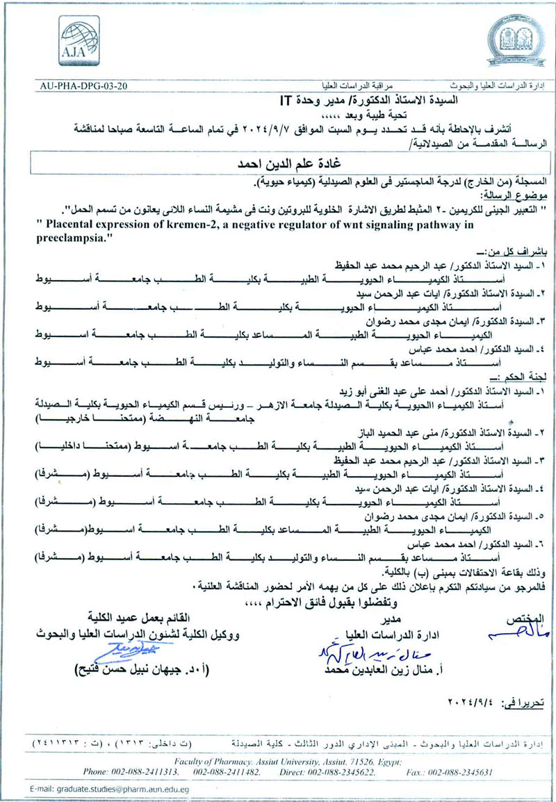 مناقشة رسالة الماجستير المقدمة من الصيدلانية / غادة علم الدين احمد المسجلة من الخارج لنيل درجة الماجستير فى العلوم الصيدلية (كيمياء حيوية ) يوم السبت 7/ سبتمبر 2024
