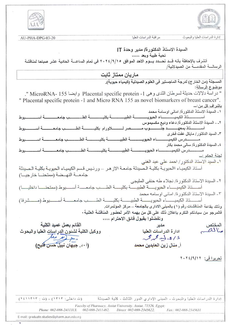 مناقشة الرسالة المقدمة من الصيدلانية / ماريان ممتاز ثابت - المسجلة من الخارج لنيل درجة الماجستير فى العلوم الصيدلية (كيمياء حيوية ) يوم الأحد 15 سبتمبر 2024