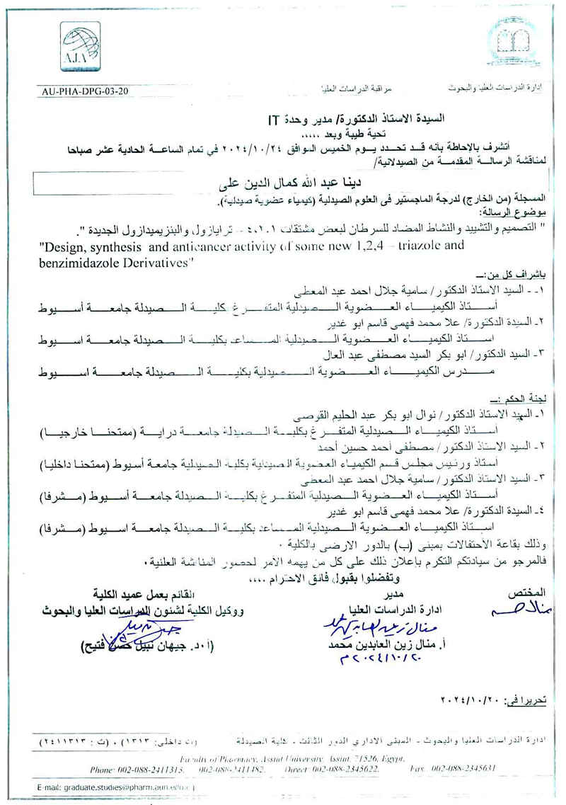 مناقشة رسالة الماجستير فى العلوم الصيدلية المقدمة من الصيدلانية/ دينا عبدالله كمال الدين على- المسجلة (من الخارج) قسم (كيمياء عضوية صيدلية )يوم الخميس الموافق 24 اكتوبر 2024