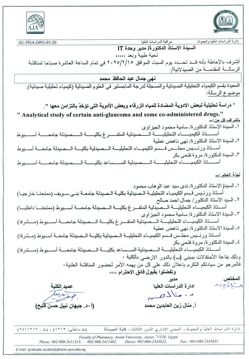 مناقشة رسالة الماجستير فى العلوم الصيدلية المقدمة من الصيدلانية/ نهى جمال عبدالحافظ محمد - المسجلة لدرجة الماجستير قسم (كيمياء تحليلية صيدلية )يوم السبت الموافق 15 فبراير 2025