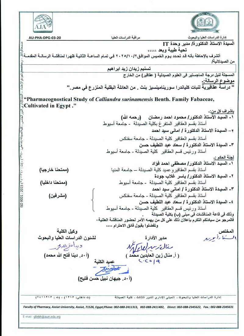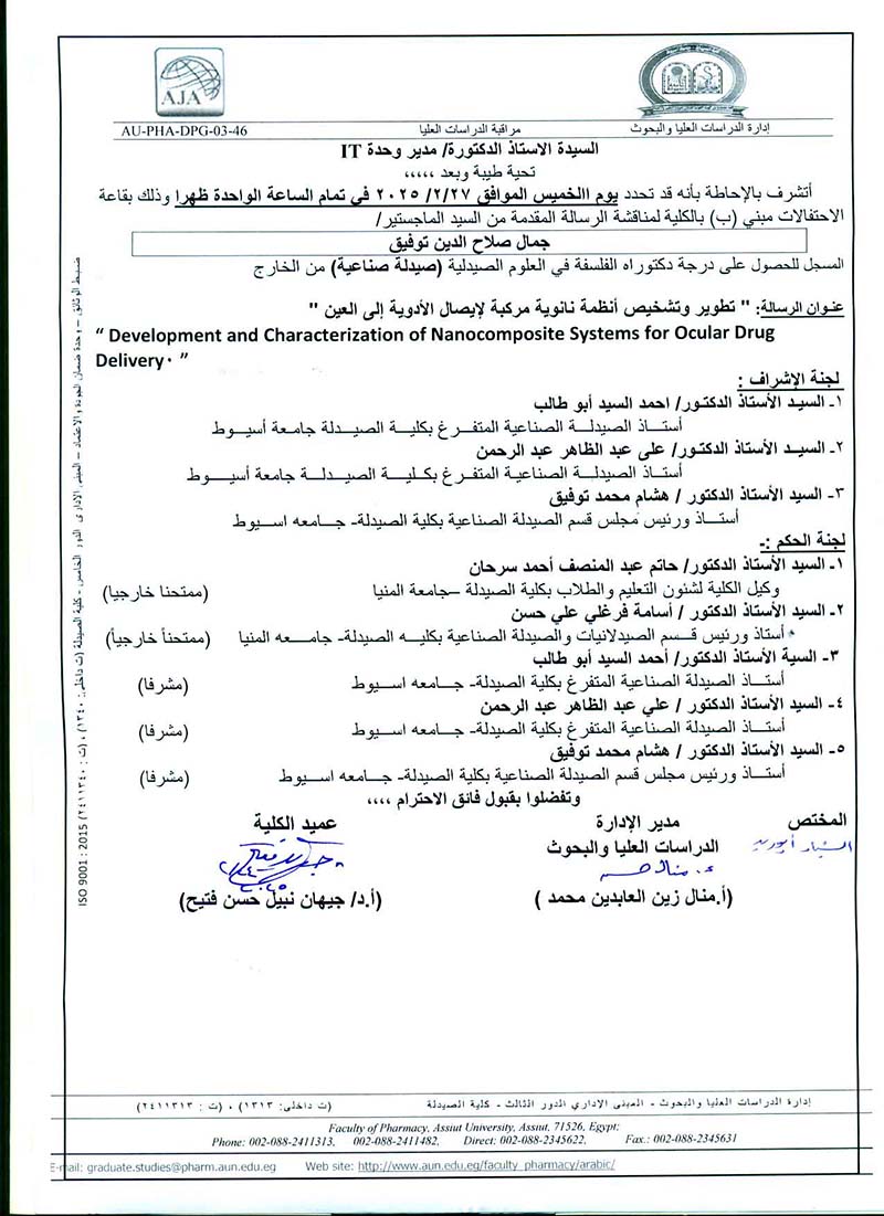 مناقشة رسالة المقدمة من السيد الماجستير / جمال صلاح الدين توفيق -و المسجل للحصول على درجة دكتوراه فى العلوم الصيدلية (صيدلة صناعية ) - يوم الخميس الموافق27 فبراير2025