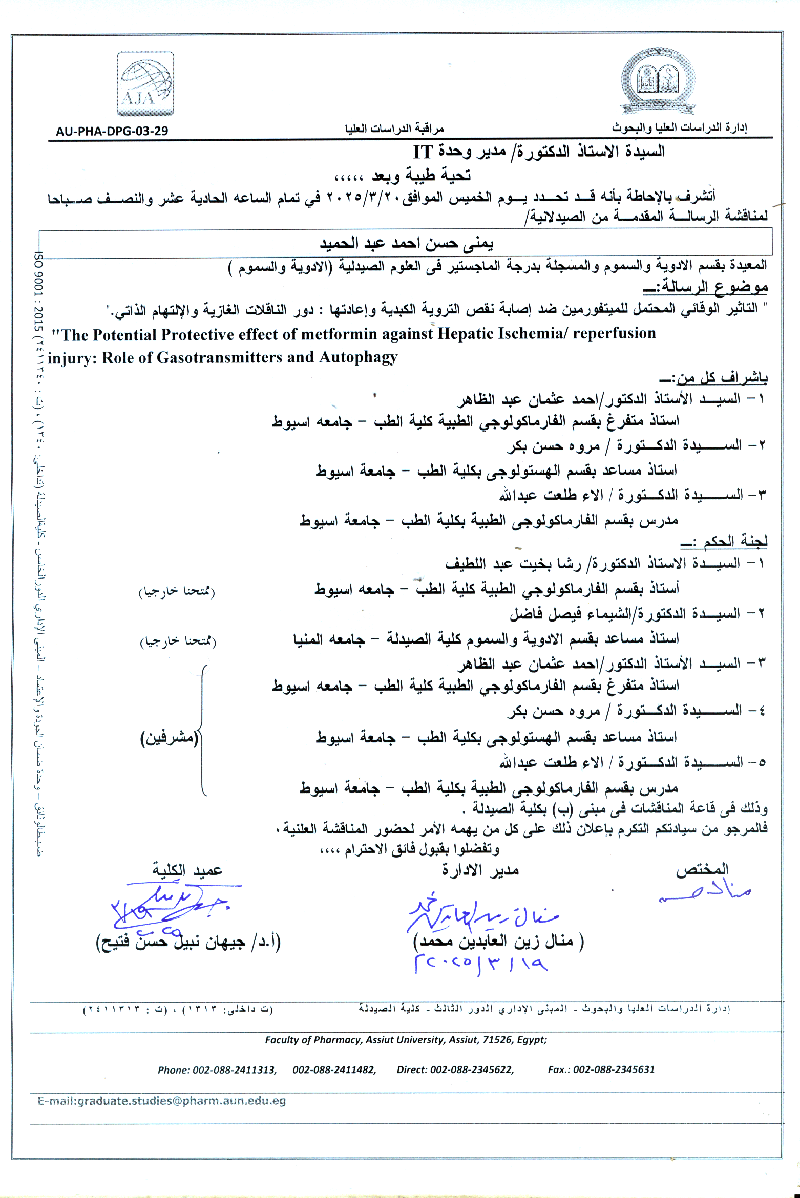 مناقشة الرسالة المقدمة من الصيدلانية/ يمنى حسن احمد عبد الحميد – المعيدة بقسم الادوية والسموم والمسجلة بدرجة الماجستير فى العلوم الصيدلية (الادوية والسموم) يوم الخميس الموافق 20 مارس 2025