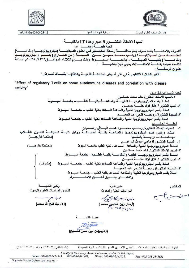 مناقشة رسالة الماجستير المقدمة من الصيدلانية/ زينب محمد حسين - المسجلة لدرجة الماجستير بقسم ميكروبيولوجيا ومناعة (من الخارج) يوم الثلاثاء 22 ابريل 2025