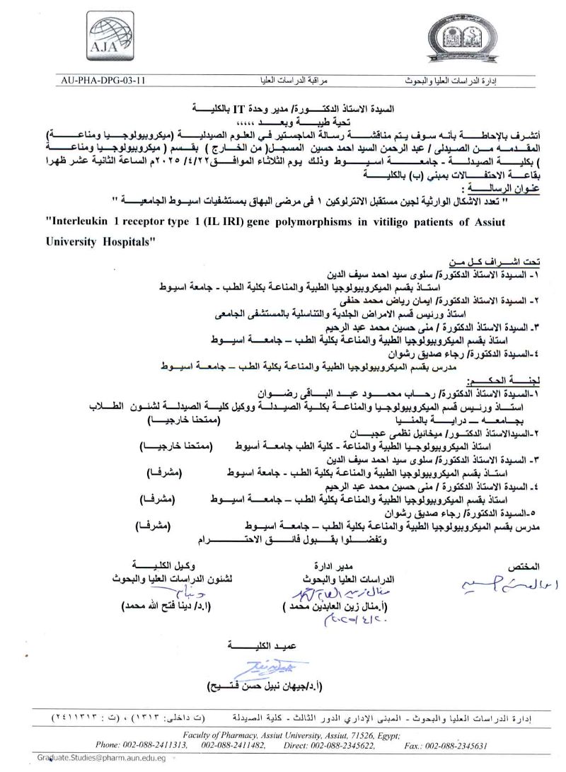 مناقشة رسالة الماجستير المقدمة من الصيدلى/ عبدالرحمن السيد أحمد حسين – المسجل لدرجة الماجستير بقسم ميكروبيولوجيا ومناعة (من الخارج) يوم الثلاثاء 22 ابريل 2025