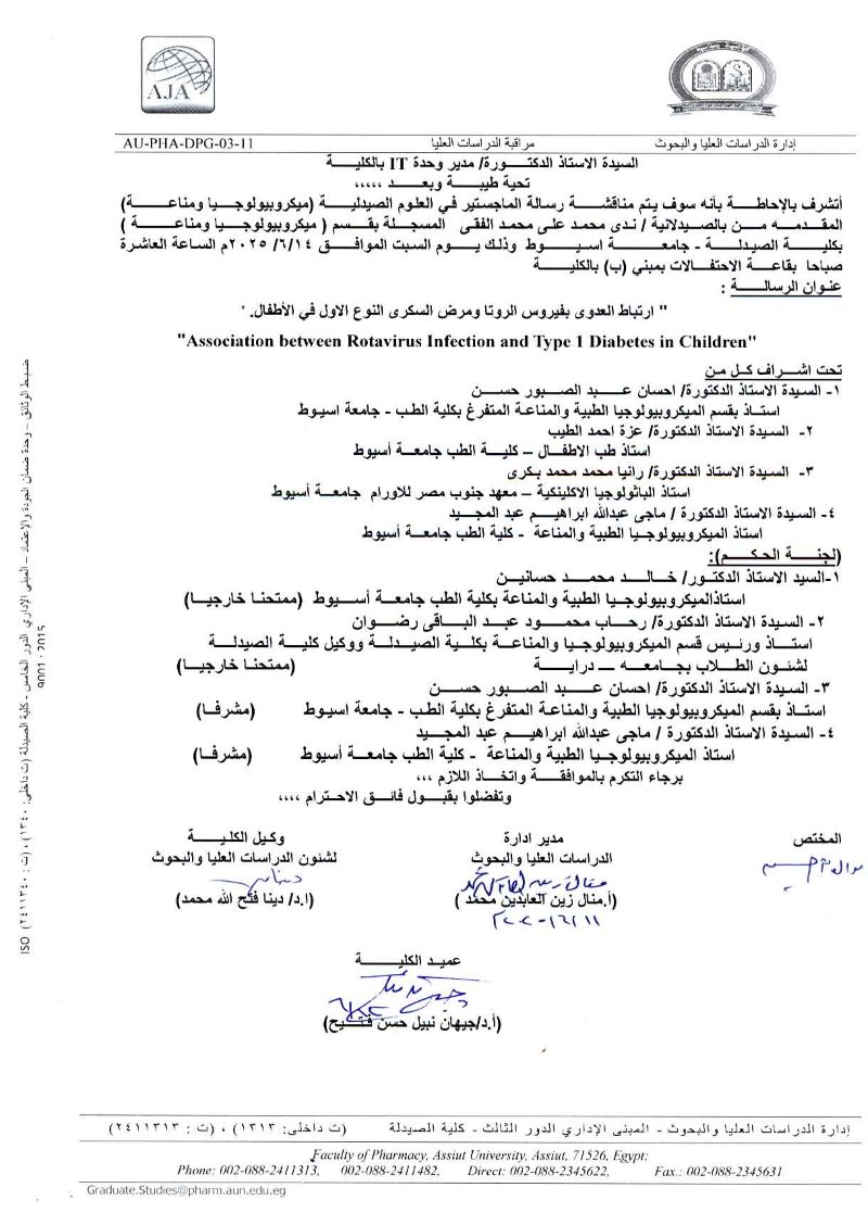 مناقشة رسالة الماجستير المقدمة من الصيدلانية / ندى محمد على محمد الفقى – المسجلة بقسم ميكربيولوجيا ومناعة يوم السبت الموافق 14 يونيو 2025
