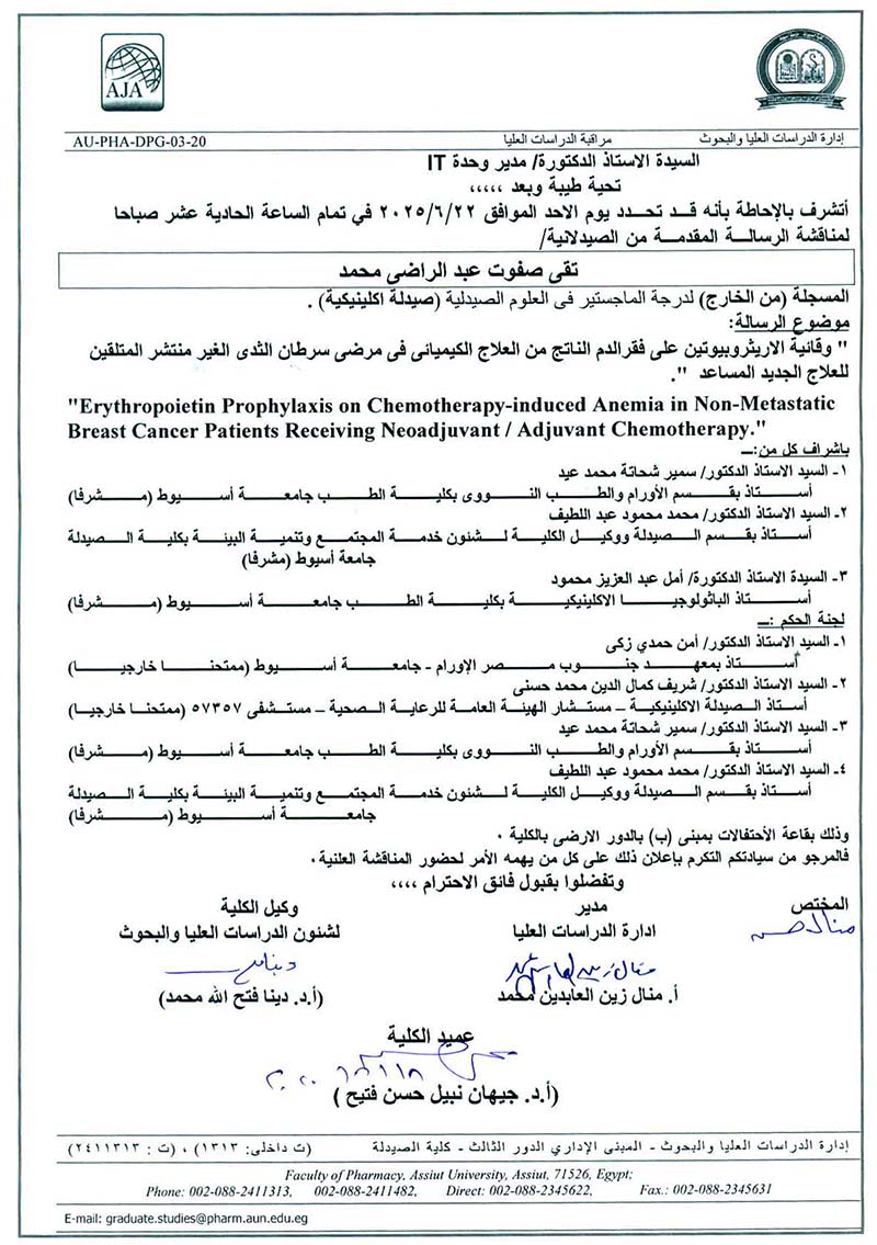 مناقشة رسالة الماجستير فى العلوم الصيدلية المقدمة من الصيدلانية/ تقى صفوت عبدالراضي محمد- المسجلة (من الخارج) لدرجة الماجستير قسم (الصيدلة الاكلينكية) يوم الاحد الموافق 22 يونيو2025