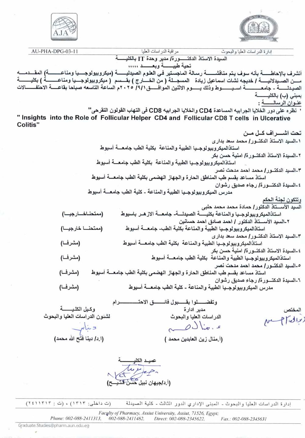 مناقشة الرسالة المقدمة من الماجستير / أية فرجانى عبد الحميد - المسجلة للحصول على درجة دكتوراه الفلسفة فى العلوم الصيدلية (ميكروبيولوجيا ومناعة) وذلك يوم الثلاثاء الموافق 2 سبتمبر 2025