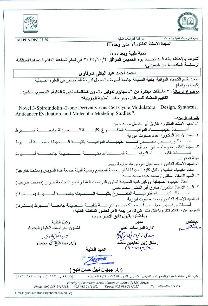 مناقشة رسالة المقدمة من الصيدلي/ محمد احمد عبدالباقي شرقاوي لنيل درجة الماجستير المعيد بقسم الكيمياء الدوائية وذلك يوم الخميس الموافق 2 اكتوبر2025