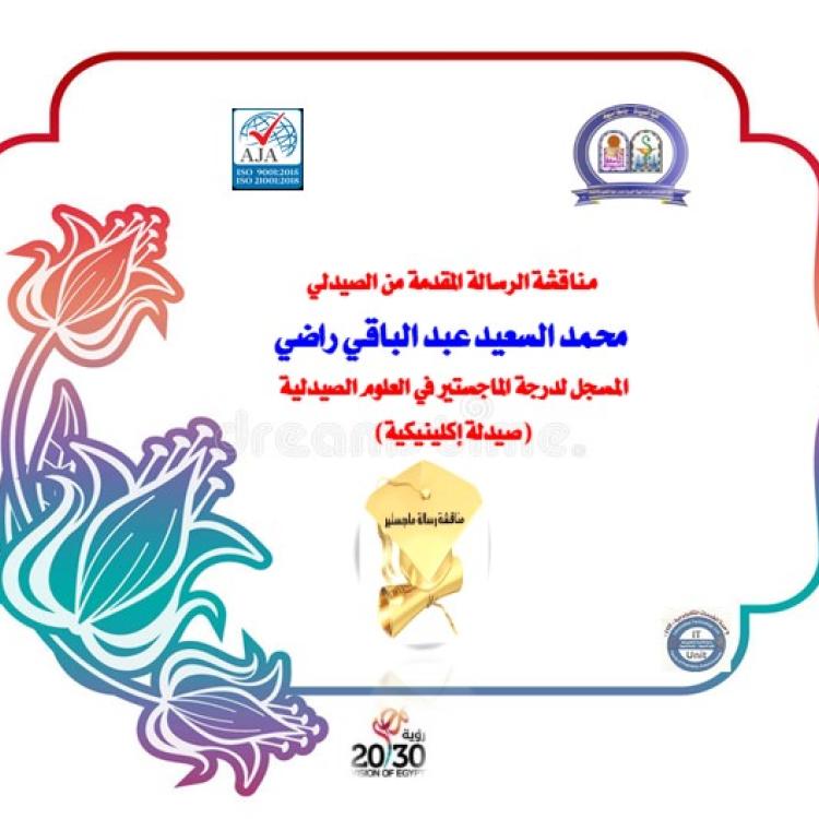 مناقشة الرسالة المقدمة من الصيدلي/ محمد السعيد عبد الباقي راضي - المسجل لدرجة الماجستير في العلوم الصيدلية (صيدلة إكلينيكية).