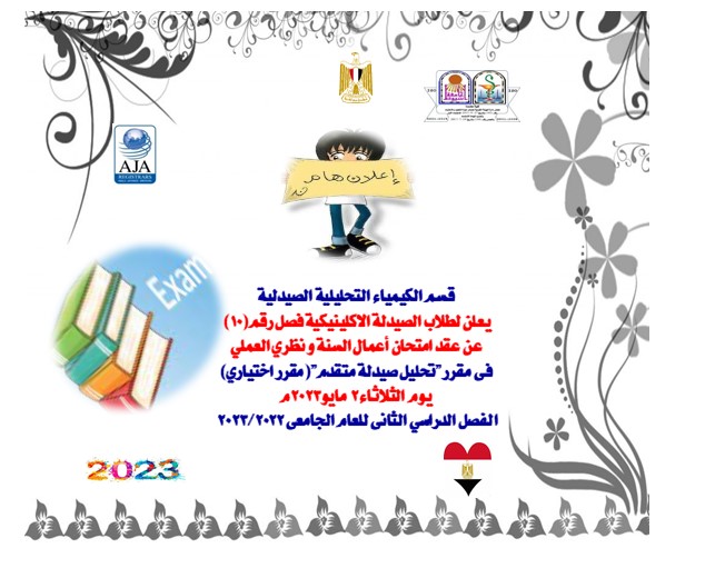 قسم الكيمياء التحليلية الصيدلية يعلن لطلاب برنامج الصيدلة الاكلينيكية فصل(10) عن عقد امتحان أعمال السنة ونظري العملي فى مقرر "تحليل صيدلى متقدم" مقرر اختياري يوم الثلاثاء 2 مايو 2023م