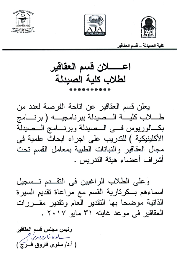 قسم العقاقير بالكلية يعلن عن إتاحة الفرصة للطلاب للتدريب علي إجراء أبحاث علمية في مجال العقاقير والنباتات الطبية. 4 مايو 2017 قسم العقاقير بالكلية يعلن عن إتاحة الفرصة للطلاب للتدريب علي إجراء أبحاث علمية في مجال العقاقير والنباتات الطبية.