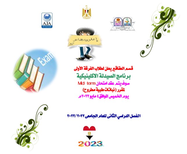 قسم العقاقير يعلن لطلاب الفرقة الأولى برنامج الصيدلة الاكلينيكية سوف يتم عقد امتحان Mid-term لمقرر (نباتات طبية مطروح) يوم الخميس الموافق 4 مايو 2023م 2 مايو 2023