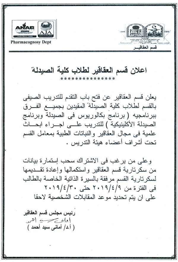 قسم العقاقير يعلن عن فتح باب التقدم للتدريب الصيفي بالقسم لطلاب كلية الصيدلة للتدريب علي إجراء أبحاث علمية في مجال العقاقير والنباتات الطبية وذلك بمعامل القسم تحت إشراف أعضاء هيئة التدريس.