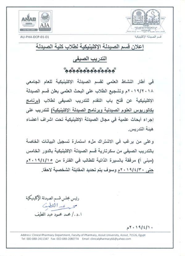قسم الصيدلة الإكلينيكية يعلن عن فتح باب التقدم للتدريب الصيفي بالقسم لطلاب بكالوريوس العلوم الصيدلية وبرنامج الصيدلة الإكلينيكية للتدريب علي إجراء أبحاث علمية في مجال الصيدلة الإكلينيكية تحت إشراف أعضاء هيئة التدريس.