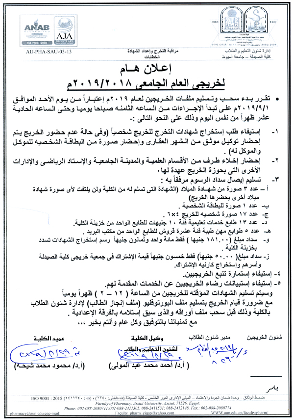 سحب وتسليم ملفات خريجي كلية الصيدلة لعام 2019م اعتباراً من الأحد 1-9-2019م. 29 أغسطس 2019 سحب وتسليم ملفات خريجي كلية الصيدلة لعام 2019م اعتباراً من الأحد 1-9-2019م.