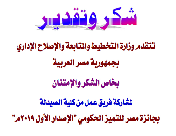 شكر وتقدير مقدم من وزارة التخطيط والمتابعة والإصلاح الإداري لكلية الصيدلة جامعة أسيوط. 2 أكتوبر 2019 شكر وتقدير مقدم من وزارة التخطيط والمتابعة والإصلاح الإداري لكلية الصيدلة جامعة أسيوط.