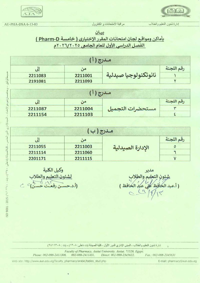 1- جدول امتحانات الفصل الدراسى الأول للعام الجامعى 2025/2026م (برنامج الصيدلة الإكلينيكية فارم دى)