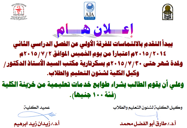تبدأ التماسات الفرقة الأولي عن الفصل الدراسي الثاني 2014/2015م اعتباراً من يوم الخميس الموافق 2/7/2015م. 2 يوليو 2015 تبدأ التماسات الفرقة الأولي عن الفصل الدراسي الثاني 2014/2015م اعتباراً من يوم الخميس الموافق 2/7/2015م.