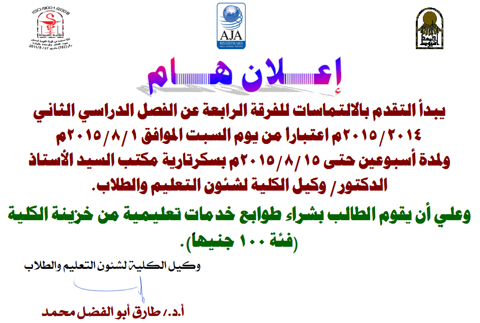 تبدأ التماسات الفرقة الرابعة عن الفصل الدراسي الثاني 2014/2015م اعتباراً من يوم السبت الموافق 1/8/2015م. 3 أغسطس 2015 تبدأ التماسات الفرقة الرابعة عن الفصل الدراسي الثاني 2014/2015م اعتباراً من يوم السبت الموافق 1/8/2015م.