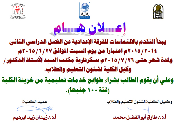 تبدأ التماسات لفرقة الإعدادية عن الفصل الدراسي الثاني 2014/2015م اعتباراً من يوم السبت الموافق 27/6/2015م. 28 يونيو 2015 تبدأ التماسات لفرقة الإعدادية عن الفصل الدراسي الثاني 2014/2015م اعتباراً من يوم السبت الموافق 27/6/2015م.