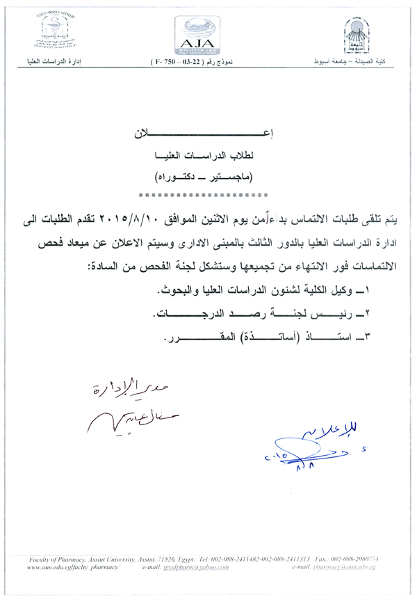 تبدأ التماسات لطلاب الدراسات العليا (ماجستير ودكتوراه) اعتباراً من يوم الاثنين الموافق 10/8/2015م. 9 أغسطس 2015 تبدأ التماسات لطلاب الدراسات العليا (ماجستير ودكتوراه) اعتباراً من يوم الاثنين الموافق 10/8/2015م.