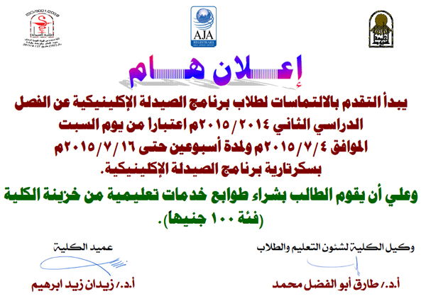 تبدأ التماسات طلاب برنامج الصيدلة الإكلينيكية عن الفصل الدراسي الثاني 2014/2015م اعتباراً من يوم السبت الموافق 4/7/2015م. 4 يوليو 2015 تبدأ التماسات طلاب برنامج الصيدلة الإكلينيكية عن الفصل الدراسي الثاني 2014/2015م اعتباراً من يوم السبت الموافق 4/7/2015م.