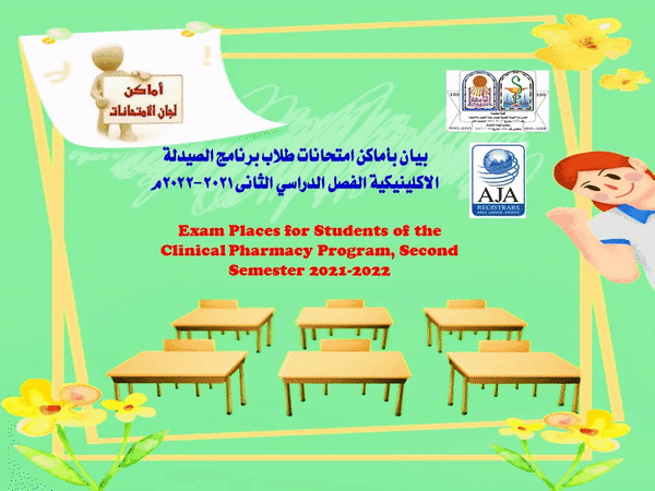 (تعديل) بيان بأماكن امتحانات طلاب برنامج الصيدلة الاكلينيكية الفصل الدراسي الثانى 2021-2022م 5 يونيو 2022