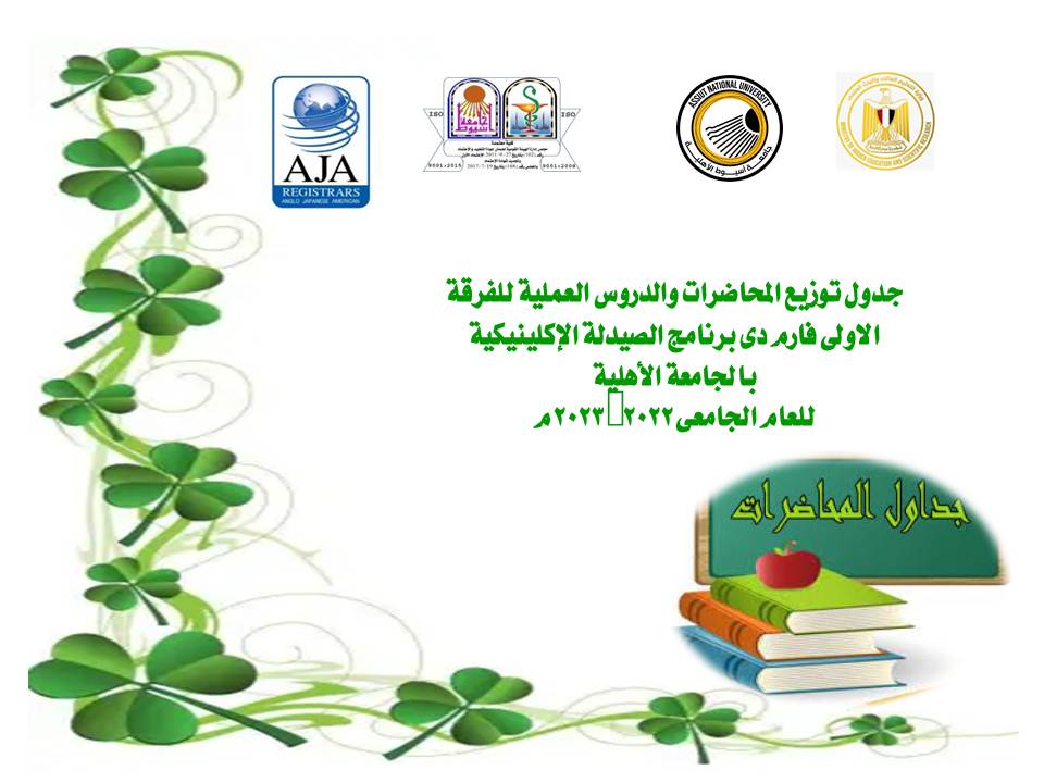 تعديل جدول توزيع المحاضرات والدروس العملية للفرقة الاولى فارم دى برنامج الصيدلة الإكلينيكية بالجامعة الأهلية للعام الجامعى 2022 \ 2023م 11 أكتوبر 2022