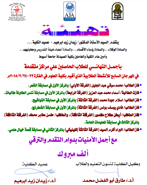 تهنئ كلية الصيدلة أبنائها الطلاب الحاصلين علي المركز الأول والثاني والثالث علي مستوي الجامعة في المهرجان السابع للأنشطة الطلابية الذي أقيم بكلية العلوم في الفترة 23-24/2/2015م.