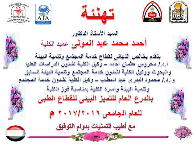تهنئة السيد الأستاذ الدكتور: أحمد محمد عبد المولي - عميد كلية الصيدلة بمناسبة فوز الكلية بالدرع العام للتميز البيئي للقطاع الطبي عن العام الجامعي 2016/2017م.