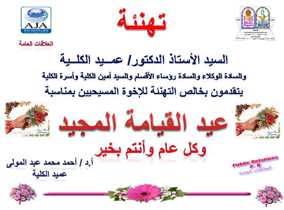 يتقدم السيد ا.د / أحمد محمد عبد المولى-عميد كلية الصيدلة - جامعة أسيوط والسادة الوكلاء والسادة رؤساء الأقسام والسيد أمين الكلية وأسرة الكلية يتقدمون بخالص التهانى القلبية إلى الطلبة والطالبات والعاملين الأقباط بالكلية والاخوة الاقباط على العموم . بمناسبة عيد الميلاد المجيد . وكل عام ومصرنا العزيزة وقياداتنا وجيشنا وشرطتنا بخير وسلام،،