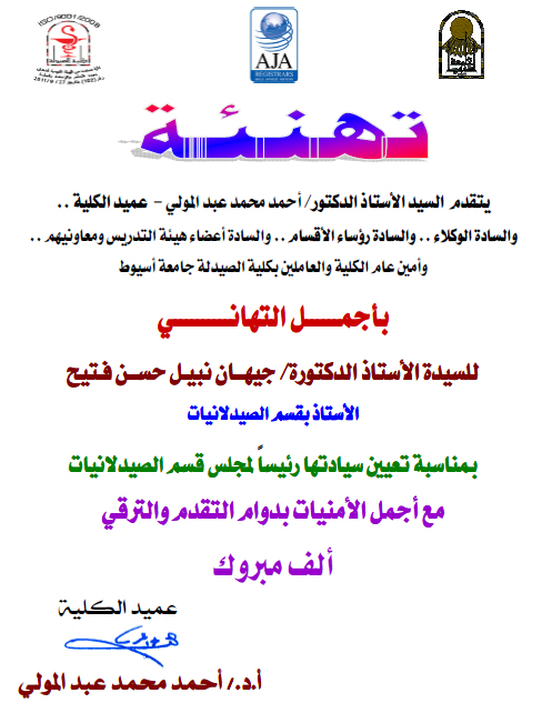 تهنئة للسيدة الأستاذ الدكتورة: جيهان نبيل حسن فتيح بمناسبة تعيين سيادتها رئيساً لمجلس قسم الصيدلانيات بكلية الصيدلة جامعة أسيوط. 11 ديسمبر 2017 تهنئة للسيدة الأستاذ الدكتورة: جيهان نبيل حسن فتيح بمناسبة تعيين سيادتها رئيساً لمجلس قسم الصيدلانيات بكلية الصيدلة جامعة أسيوط.