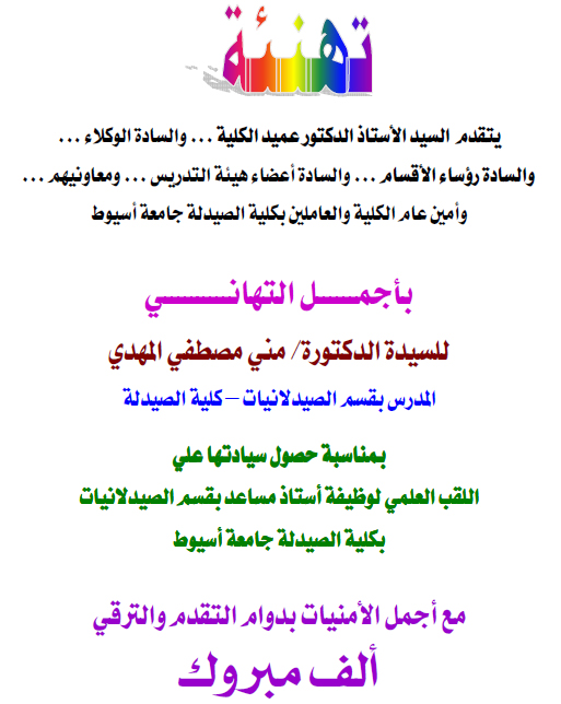 تهنئة للسيدة الدكتورة/ مني مصطفي المهدي بمناسبة حصول سيادتها علي اللقب العلمي لوظيفة أستاذ مساعد بقسم الصيدلانيات بكلية الصيدلة جامعة أسيوط. 1 يوليو 2014 تهنئة للسيدة الدكتورة/ مني مصطفي المهدي بمناسبة حصول سيادتها علي اللقب العلمي لوظيفة أستاذ مساعد بقسم الصيدلانيات بكلية الصيدلة جامعة أسيوط.