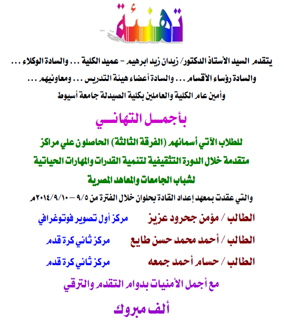 طلاب بالفرقة الثالثة صيدلة يحصلون علي مراكز متقدمة خلال الدورة التثقيفية لتنمية القدرات والمهارات الحياتية لشباب الجامعات والمعاهد المصرية. 13 سبتمبر 2014 طلاب بالفرقة الثالثة صيدلة يحصلون علي مراكز متقدمة خلال الدورة التثقيفية لتنمية القدرات والمهارات الحياتية لشباب الجامعات والمعاهد المصرية.