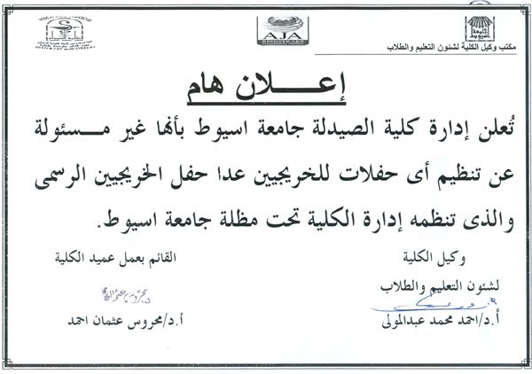 تعلن إدارة الكلية عن عدم مسئوليتها عن أي حفل للخريجين عدا الحفل الرسمي الذي تنظمه الإدارة. 27 سبتمبر 2017 تعلن إدارة الكلية عن عدم مسئوليتها عن أي حفل للخريجين عدا الحفل الرسمي الذي تنظمه الإدارة.