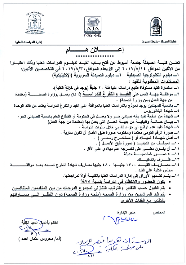تعلن كلية الصيدلة – جامعة أسيوط عن فتح باب القيد لدبلوم الدراسات العليا إعتبارا من 14-8 وحتي 30-8-2017م. 6 أغسطس 2017 تعلن كلية الصيدلة – جامعة أسيوط عن فتح باب القيد لدبلوم الدراسات العليا إعتبارا من 14-8 وحتي 30-8-2017م.