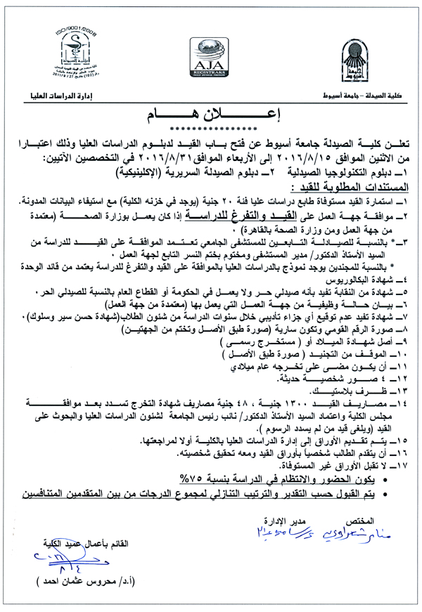 تعلن كلية الصيدلة جامعة أسيوط عن فتح باب القيد لدبلوم الدراسات العليا اعتبارا من الاثنين الموافق 15/8/2016م، ومرفق المستندات المطلوبة للقيد. 7 أغسطس 2016 تعلن كلية الصيدلة جامعة أسيوط عن فتح باب القيد لدبلوم الدراسات العليا اعتبارا من الاثنين الموافق 15/8/2016م، ومرفق المستندات المطلوبة للقيد.