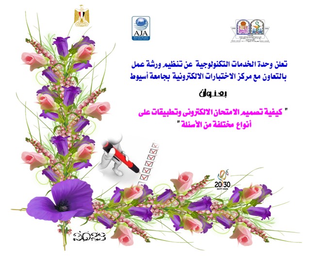 تعلن وحدة الخدمات التكنولوجية عن تنظيم ورشة عمل بالتعاون مع مركز الاختبارات الالكترونية بجامعة أسيوط بعنوان:- " كيفية تصميم الامتحان الالكترونى وتطبيقات على أنواع مختلفة من الأسئلة "