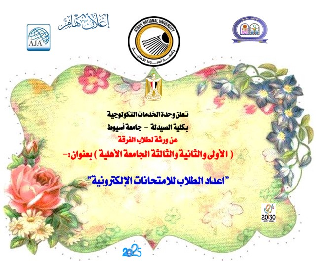 تعلن وحدة الخدمات التكولوجية بكلية الصيدلة - جامعة أسيوط عن ورشة لطلاب الفرقة ( الأولى والثانية والثالثة الجامعة الأهلية ) بعنوان:- "اعداد الطلاب للامتحانات الإلكترونية"