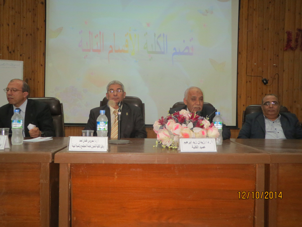 تحت رعاية السيد الأستاذ الدكتور / زيدان زيد إبرهيم – عميد الكلية ، وبحضور السادة الوكلاء؛ السيد الأستاذ الدكتور/ حسن فرغلى عزقل – وكيل الكلية لشئون الدراسات العليا والبحوث ، والسيد الأستاذ الدكتور/ محروس عثمان أحمد – وكيل الكلية لشئون خدمة المجتمع وتنمية البيئة ، والسيد الأستاذ الدكتور/ طارق أبوالفضل محمد – وكيل الكلية لشئون التعليم والطلاب ، والسادة رؤساء مجالس الأقسام والسادة أعضاء هيئة التدريس ومعاونيهم ، وإدارة العلاقات العامة ، وإدارة رعاية الشباب أقيمت احتفالية استقبال الطلاب الجدد للعام الجامعي 2014/2015م حيث تم خلال الاحتفالية الترحيب بالطلاب الجدد وتهنئتهم وتعريفهم بالكلية بداية من الإدارة والمباني والأقسام والمعامل والمدرجات والأماكن الخدمية مثل شئون الطلاب ورعاية الشباب والمكتبات ومعامل الحاسب الآلي ومركز توزيع الكتاب والصيدلية المجتمعية والعلاقات العامة وأماكن المحاضرات والسكاشن بالكلية والكليات المشتركة.