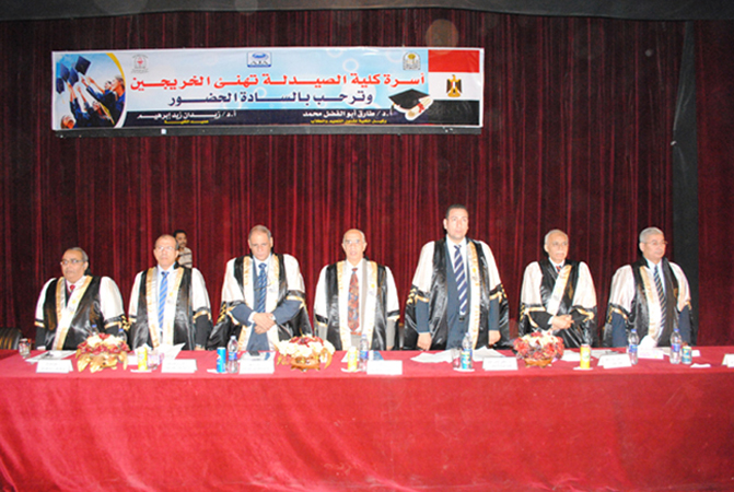 - · تحت رعاية السيد الوزير المهندس/ ياسر الدسوقى - محافظ أسيوط، والسيد الأستاذ الدكتور/ محمد عبدالسميع عيد - رئيس الجامعة، نظمت كلية الصيدلة احتفالية كبيرة لخريجي الدفعة "49" بكالوريوس العلوم الصيدلية وذلك بحضور السيد الأستاذ الدكتور/ أحمد عبده جعيص - نائب رئيس الجامعة لشئون الدراسات العليا والبحوث ، والسيد الأستاذ الدكتور/ عادل ريان محمد - نائب رئيس الجامعة لشئون التعليم والطلاب، والسيد الأستاذ الدكتور/ زيدان زيد إبرهيم - عميد الكلية، والسيد الأستاذ الدكتور/ طارق أبو الفضل - وكيل الكلية لشئون التعليم والطلاب، والسيد الأستاذ الدكتور/ حسن فرغلى عزقل- وكيل الكلية لشئون الدراسات العليا والبحوث، والسيد الأستاذ الدكتور/ محروس عثمان أحمد - وكيل الكلية لشئون خدمة المجتمع وتنمية البيئة، والسيد الدكتور/ محيى الدين إبراهيم – النقيب العام لصيادلة مصر.
