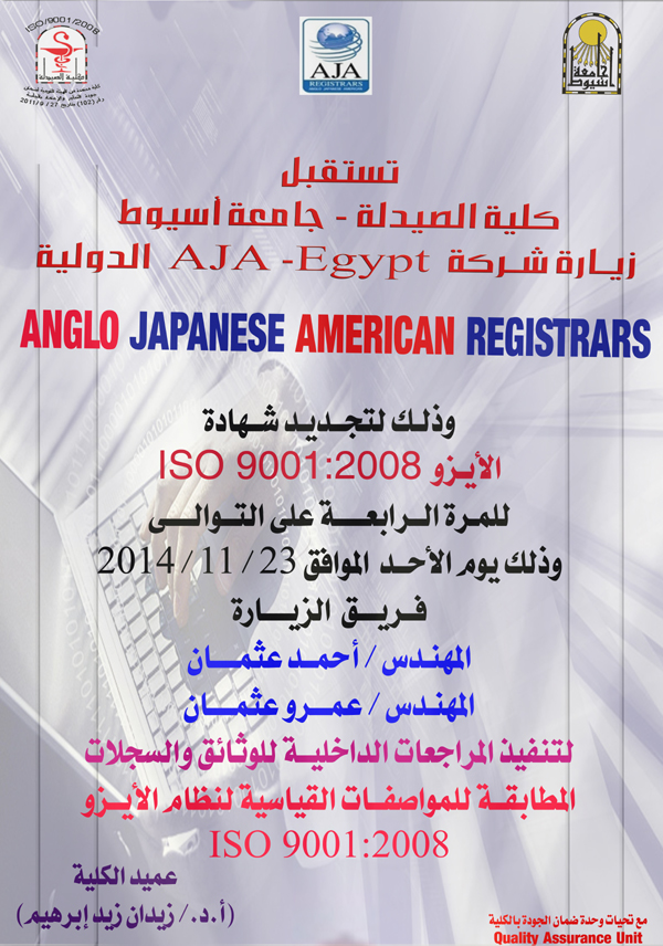 تستقبل كلية الصيدلة زيارة شركة AJA-Egypt الدولية يوم الأحد الموافق 23/11/2014م وذلك لتجديد شهادة الأيزو ISO 9001/2008 للمرة الرابعة علي التوالي.