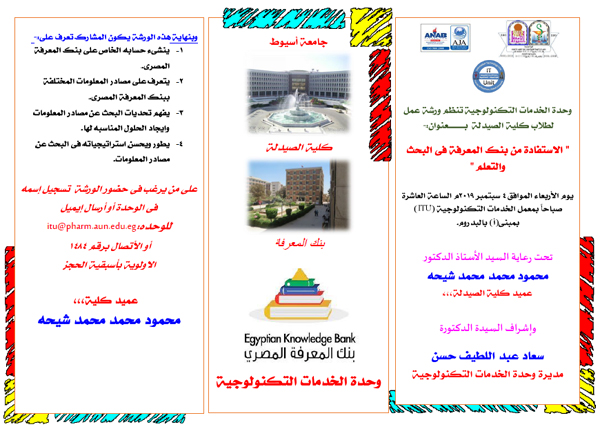 وحدة الخدمات التكنولوجية تنظم ورشة عمل لطلبة كلية الصيدلة بعنوان "الاستفادة من بنك المعرفة في البحث والتعلم" يوم الأربعاء الموافق 4-9-2019م. 29 أغسطس 2019 وحدة الخدمات التكنولوجية تنظم ورشة عمل لطلبة كلية الصيدلة بعنوان "الاستفادة من بنك المعرفة في البحث والتعلم" يوم الأربعاء الموافق 4-9-2019م.